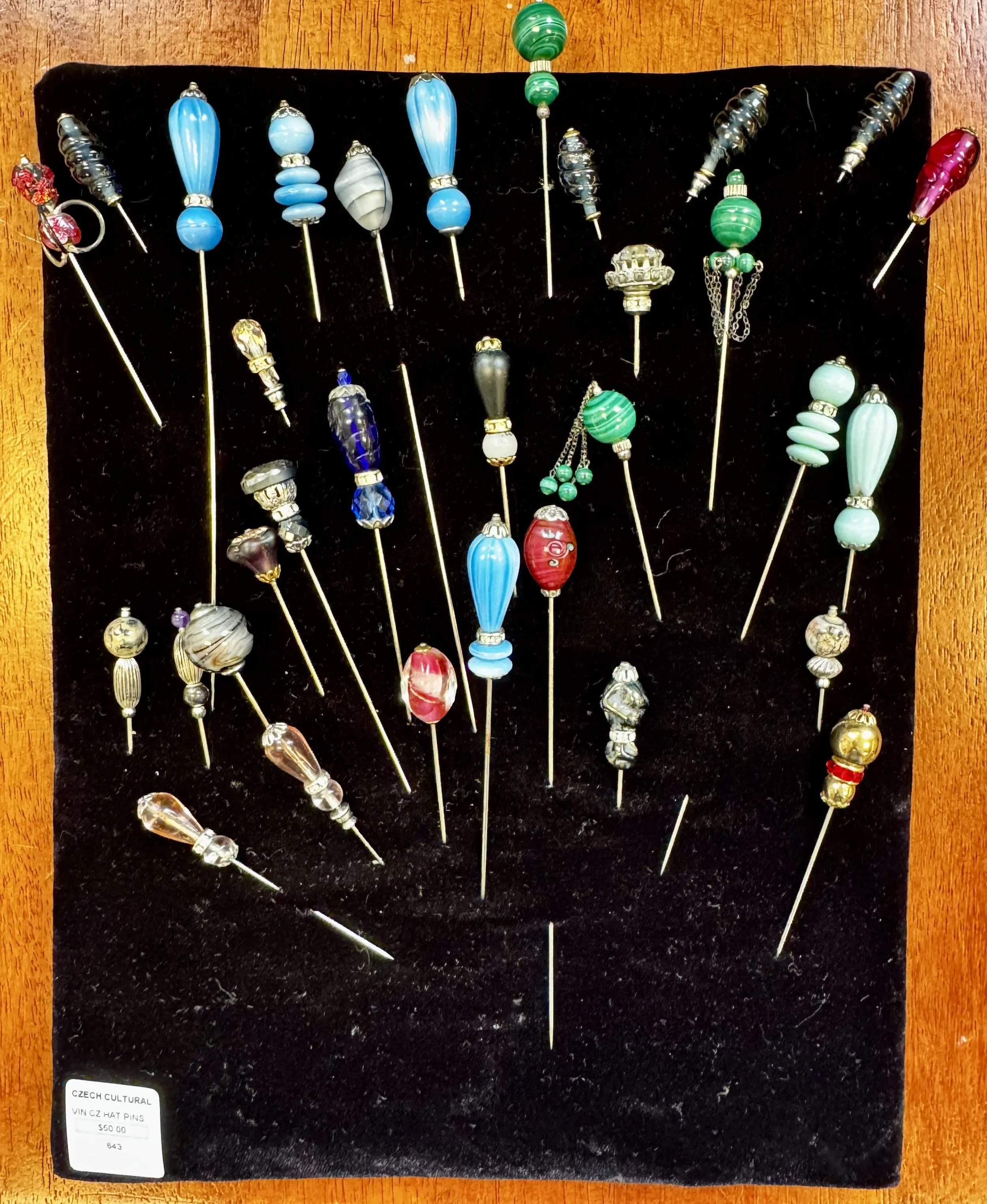 Figure 5. Vintage hat pins from the Czech Center Museum Houston. Similar ones would have been made in Jablonec. Photo by author.