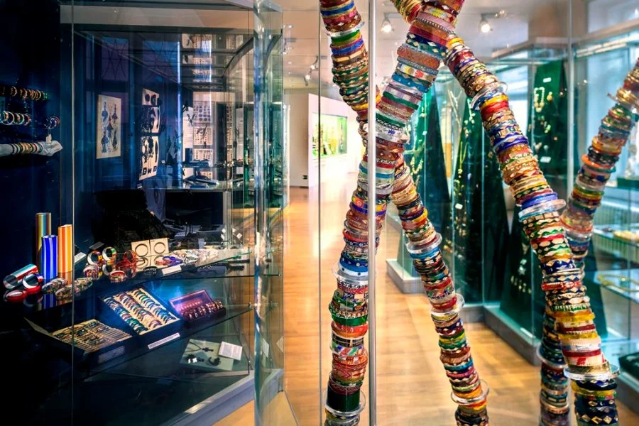 Figure 4. Examples of exported bangles from Jablonec, currently housed in the Museum of Glass and Jewellery. Photo from the Museum of Glass and Jewellry in Jablonex nad Nisou. https://www.msb-jablonec.cz/en/expositions/the-endless-story-of-jewellery.