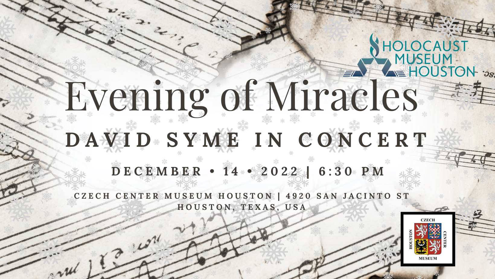 Performance is Wednesday, December 14, 6:30 PM at Czech Center Museum Houston. Doors open at 5:45 PM with light refreshments and exhibit viewing of “Surviving Through Art”. Enjoy desserts while mingling with the performer and other patrons post-concert. Complimentary valet parking will be available.