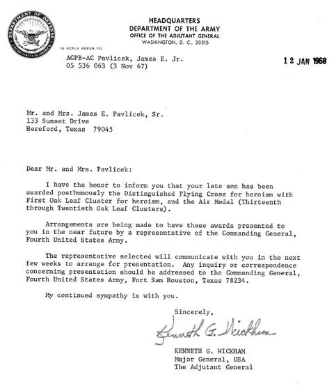 1st Lt. Pavlicek Jr. would be memorialized with other Vietnam veterans at Saint Anthonys Cemetery, in Hereford, Texas.