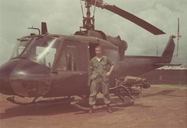 1st Lt. James Emil Pavlicek Jr. is seen posing in front of a Bell UH-1 Iroquois military helicopter. These aircraft were nicknamed "Hueys."