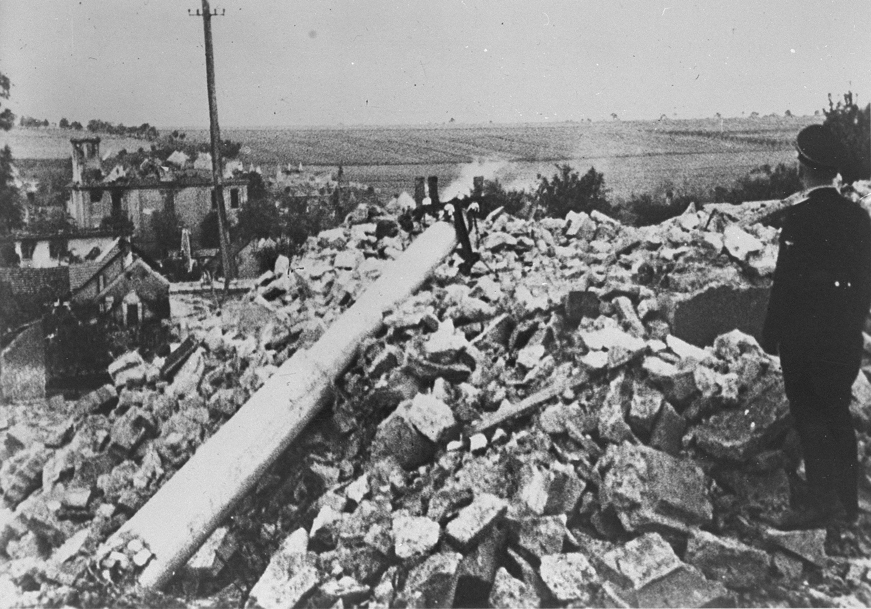 An SS officer surveys the ruins of Lidice during the destruction of the village. United States Holocaust Memorial Museum, courtesy of Library of Congress. https://collections.ushmm.org/search/catalog/pa5391