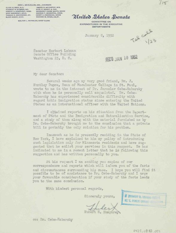 Letter from Senator Humphrey to Senator Lehman of New York, requesting assistance for the granting of citizenship for Dr. Jaroslav Cebe-Habersky. Taken from Columbia University Digital collection at https://www.columbia.edu/cu/lweb/digital/collections/rbml/lehman/pdfs/0425/ldpd_leh_0425_0080.pdf.