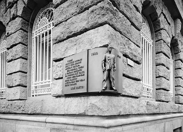 Memorial plaque for the victims of torture on the corner of Petschek Palace. Photo by David Kumermann. Taken from https://praha.mkc.cz/en/place/kolaborace/petschkuv-palac.